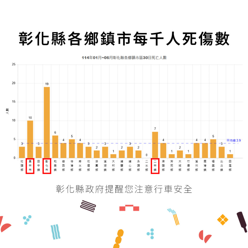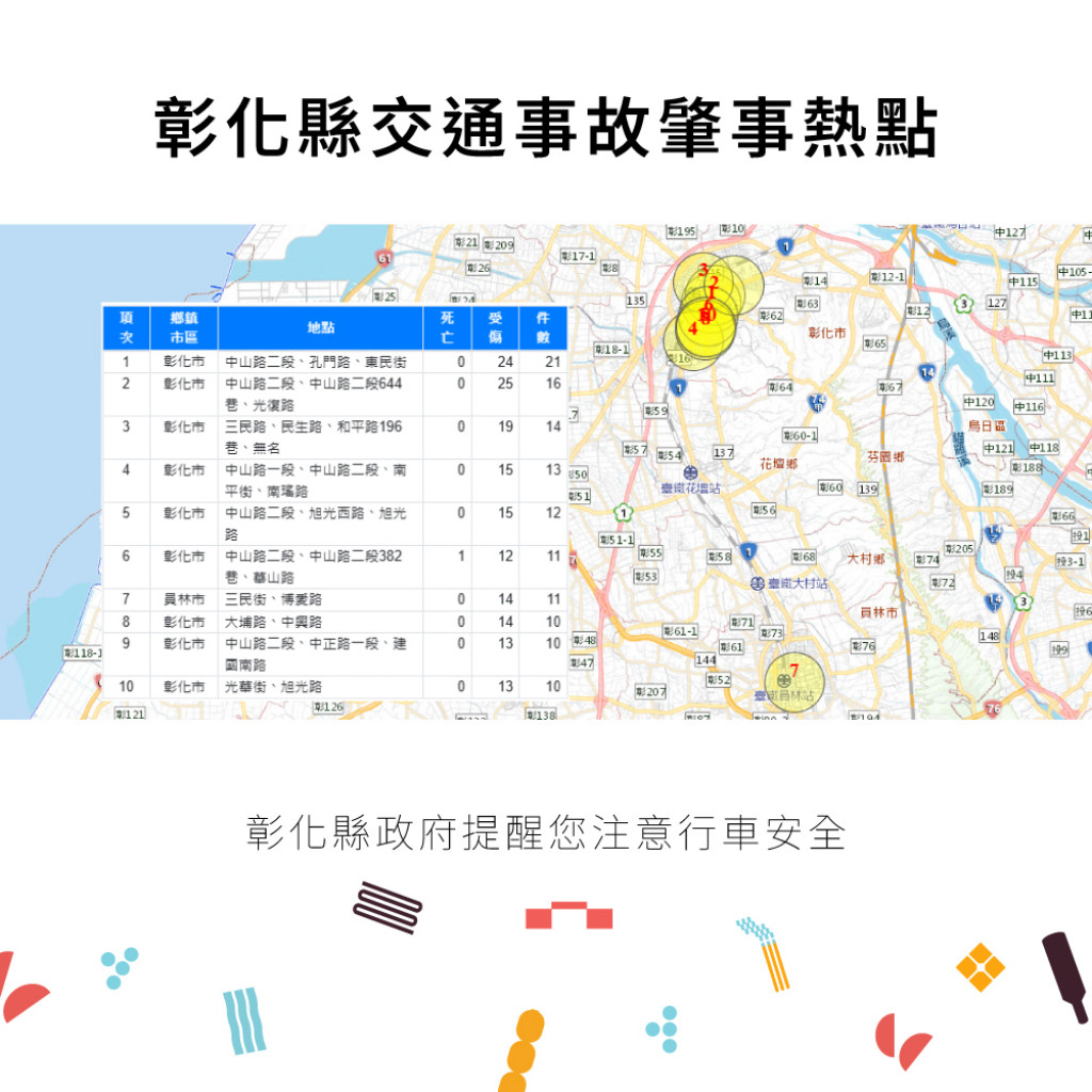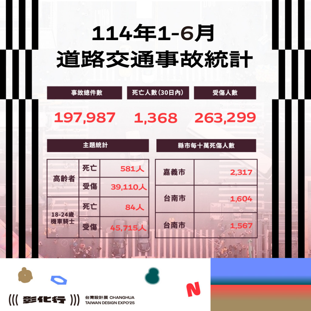 6.附件為「114年1-6月全國道路交通事故統計、彰化縣交通事故總覽、本縣各鄉鎮市每千人死傷人數及肇事熱點」共4份統計資料宣導圖。