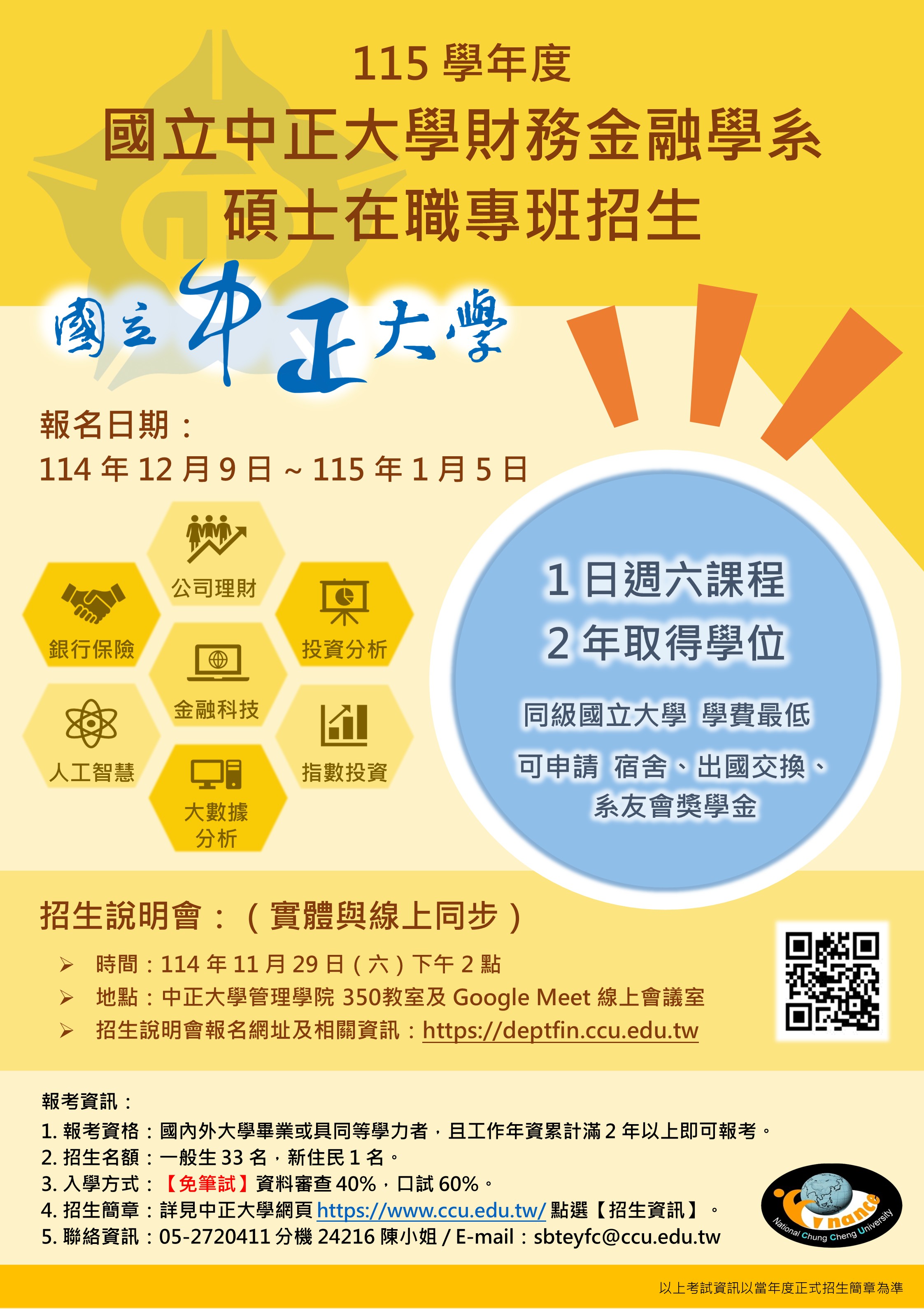 四、報名簡章請至該校網頁「招生資訊系統」(https://exams. ccu.edu.tw/index.php)下載,詳細資訊請洽該班網頁 (https://deptfin.ccu.edu.tw/)或逕洽該班辦公室(05) 2720411轉24216,承辦人:陳小姐洽詢。