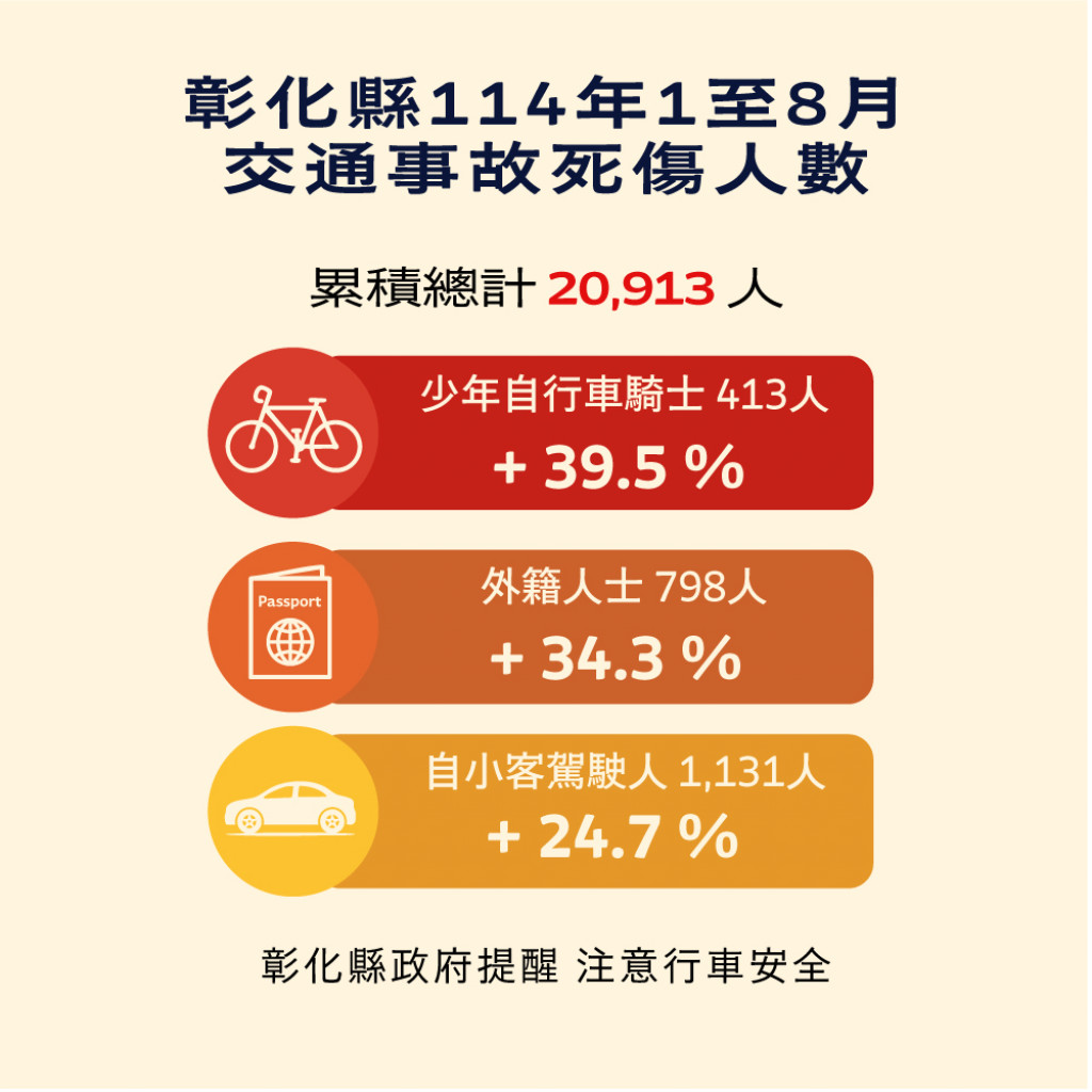 1.本縣114年1-8月道路交通事故死傷累計20,913人。
