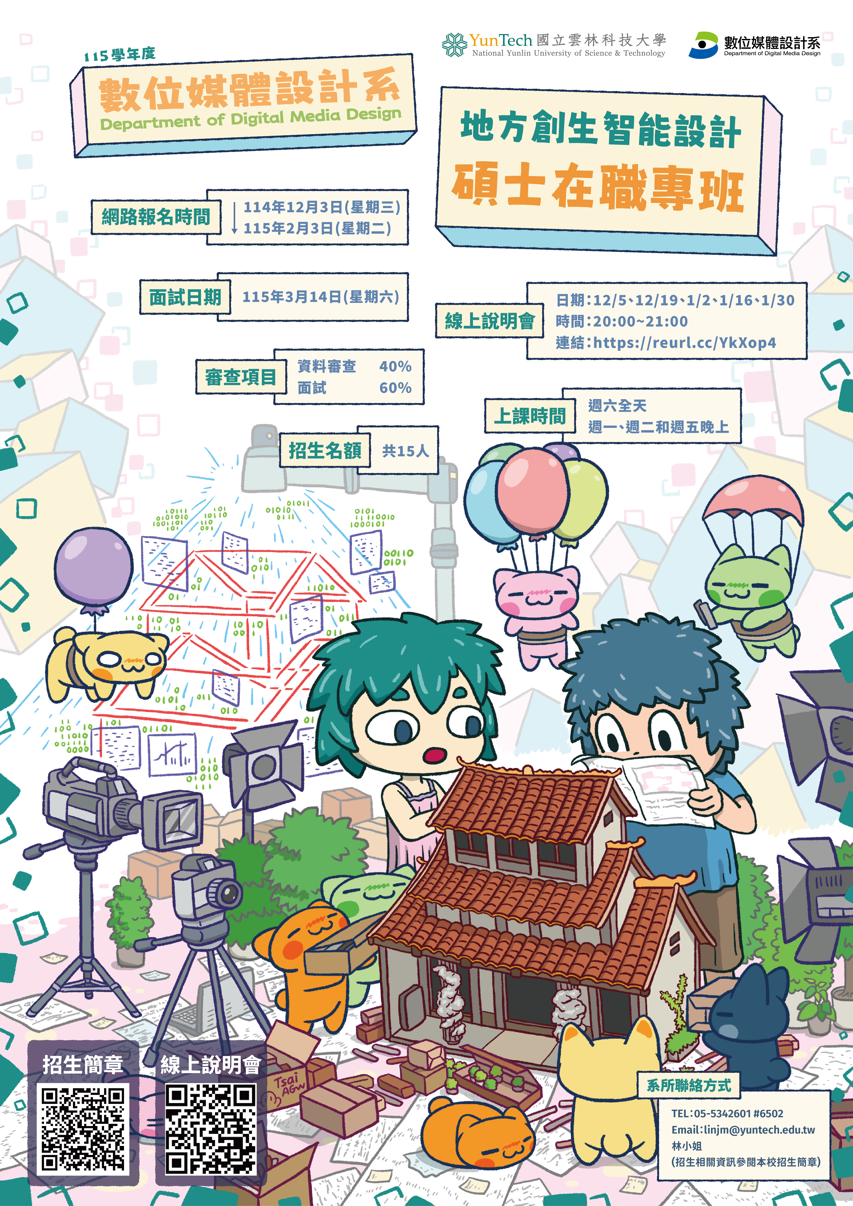 一、旨揭招生報名日期自114年12月3日至115年2月3日23時59分(含系統確定送出,逾期不受理),一律採網路報名,招生簡章網址:https://examweb.yuntech.edu.tw/Exams/Docs/Exam_W/115/GenlReg.pdf。