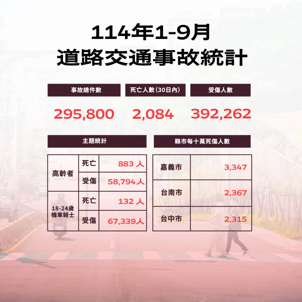 6.附件為「114年1-9月全國道路交通事故統計、彰化縣交通事故死傷人數增加排行、本縣各鄉鎮市30日死亡人數、肇事熱點及交通事故肇因統計」共5份統計資料宣導圖。