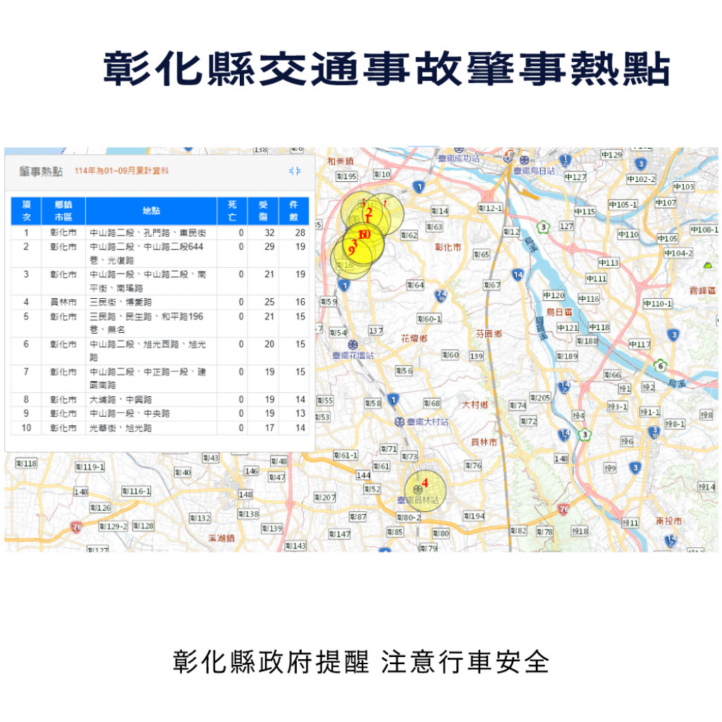 5.根據交通部道安資訊查詢網,本縣114年1-9月道路交通事故與112年同期比較分析,以少年自行車騎士(含電自、電輔) 事故增加45%最高,外籍人士事故增加34.3%次之,自小客車駕駛人增加26%再次之。1-9月份鄉鎮市30日死亡人數於「彰化市、員林市、二林鎮」為多,肇事熱點以「彰化市」為多。