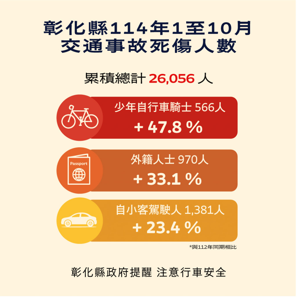 2.根據交通部道安資訊查詢網,本縣114年1-10月道路交通事故與112年同期比較分析,以少年自行車騎士(含電自、電輔) 事故增加47.8%最高,外籍人士事故增加33.1%次之,自小客車駕駛人增加23.4%再次之。1-10月份鄉鎮市30日死亡人數於「彰化市、員林市、二林鎮、鹿港鎮」為多,肇事熱點以「彰化市」為多。