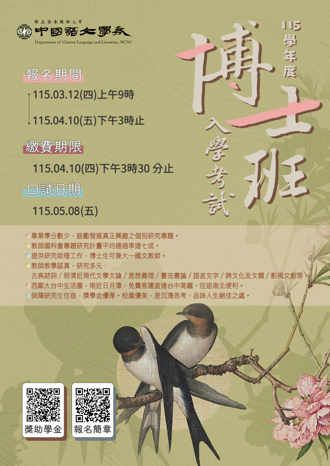 一、報名期間:115年3月12日上午9時至115年4月10日下午3時;繳費期限至115年4月10日下午3時30分。