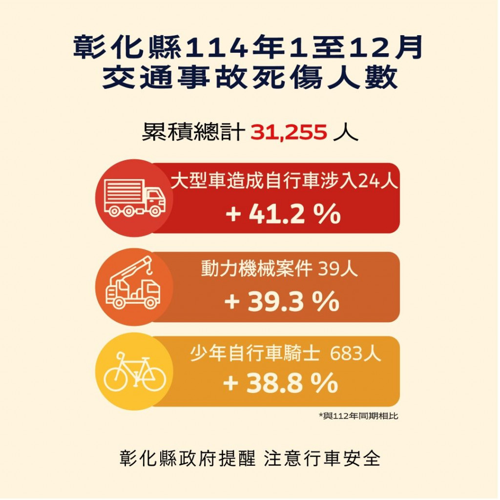 2.根據交通部道安資訊查詢網,本縣114年1-12月道路交通事故與112年同期比較分析,以大型車造成自行車涉入(含電自、電輔)事故增加41.2%最高, 動力機械案件 增加39.3%次之。少年自行車騎士(含電自、電輔) 增加38.8%再次之。1-12月份鄉鎮市30日死亡人數於「彰化市、員林市、鹿港鎮」為多,肇事熱點以「彰化市」為多。