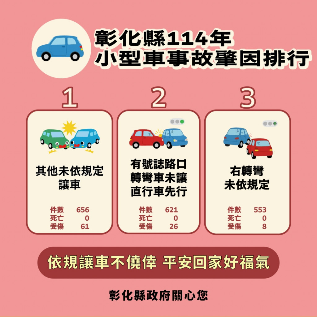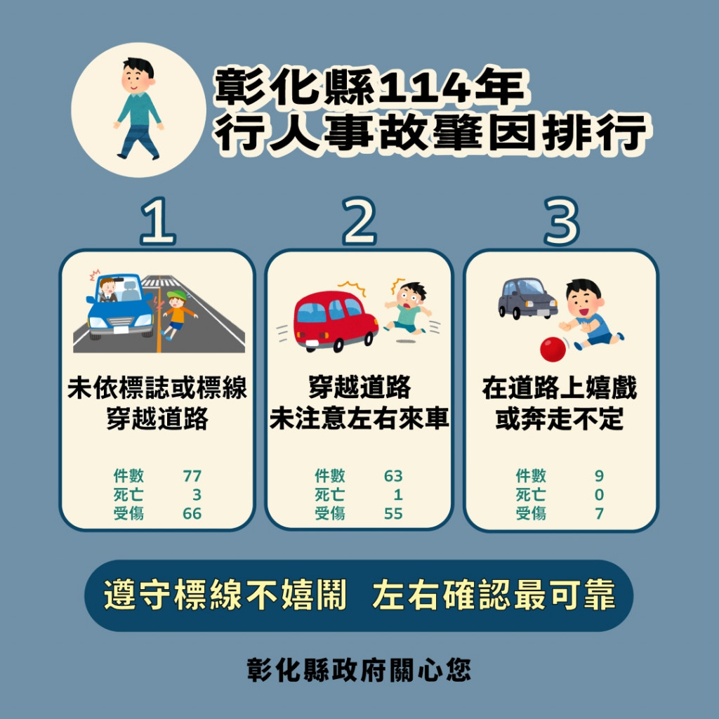 4.附件為「114年1-12月彰化縣交通事故死傷人數增加排行、本縣各鄉鎮市30日死亡人數、各運具交通事故肇因及肇事熱點」統計資料宣導圖 |
